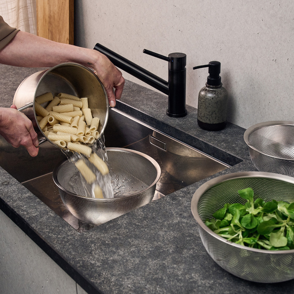 ست آبکش زویلینگ Prep 1030706 شامل ۳ آبکش استیل ضدزنگ ۱۸/۱۰ با طراحی مینیمال است. مناسب برای صاف کردن، شستشو و آبکشی پاستا، میوه و سبزیجات. سوراخهای دقیق برای تخلیه سریع، ضدخش و بدون بو گرفتن.