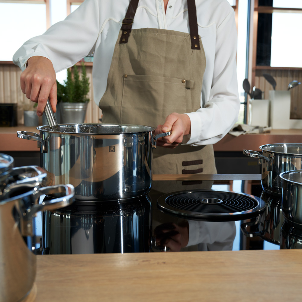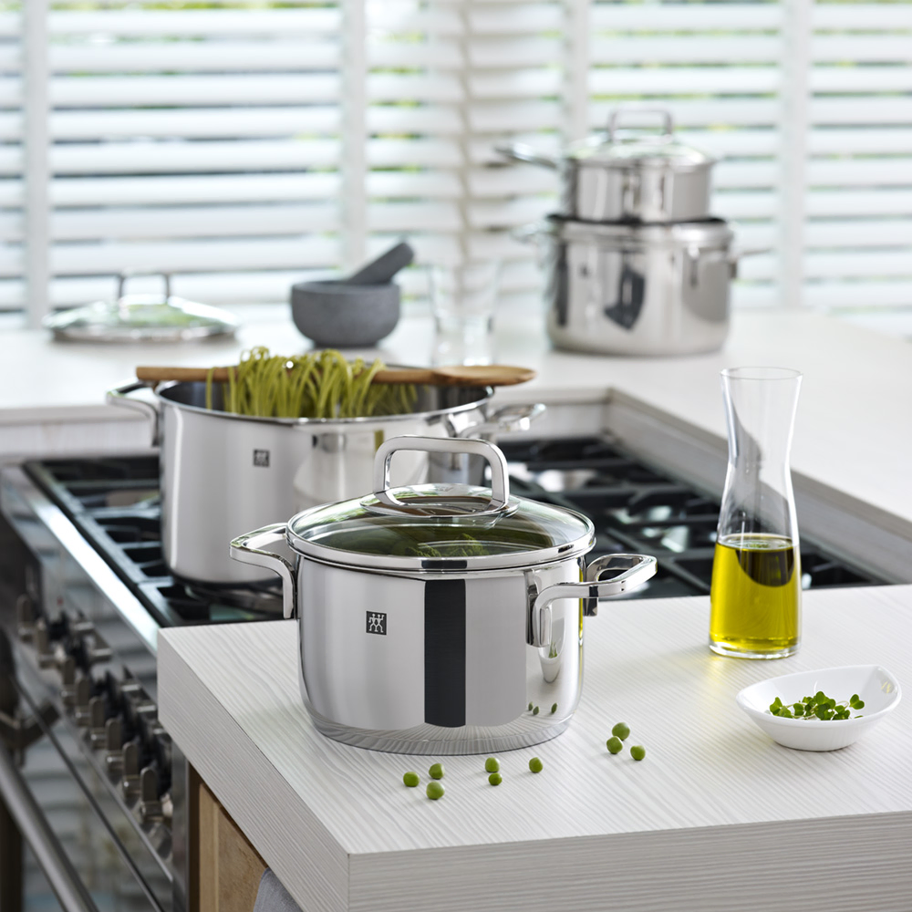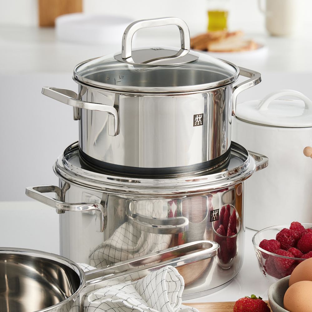 سرویس قابلمه زویلینگ کوادرو مدل ZG-65060-000، مجموعهای ۹ تایی از سری Quadro است که با طراحی مدرن منحصربهفرد، فضای ذخیرهسازی را بهینه کرده و پخت حرفهای را برای خانوادههای متوسط تا بزرگ (تا ۶-۸ نفر) فراهم میکند. جنس استیل ضدزنگ 18/10 با لبههای ریختهگریشده، ریختن بدون چکه را ممکن ساخته و مناسب تمام اجاقها (از جمله القایی) است. دستههای فولادی توخالی خنکمانده ، ایمنی و راحتی را افزایش میدهند. این سرویس با دوام بالا، تمیزکاری آسان و حفظ طعم غذا، گزینهای ایدهآل برای پخت سوپ، خورش، برنج یا سرخکردن روزانه است