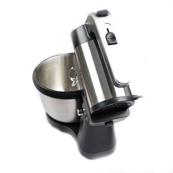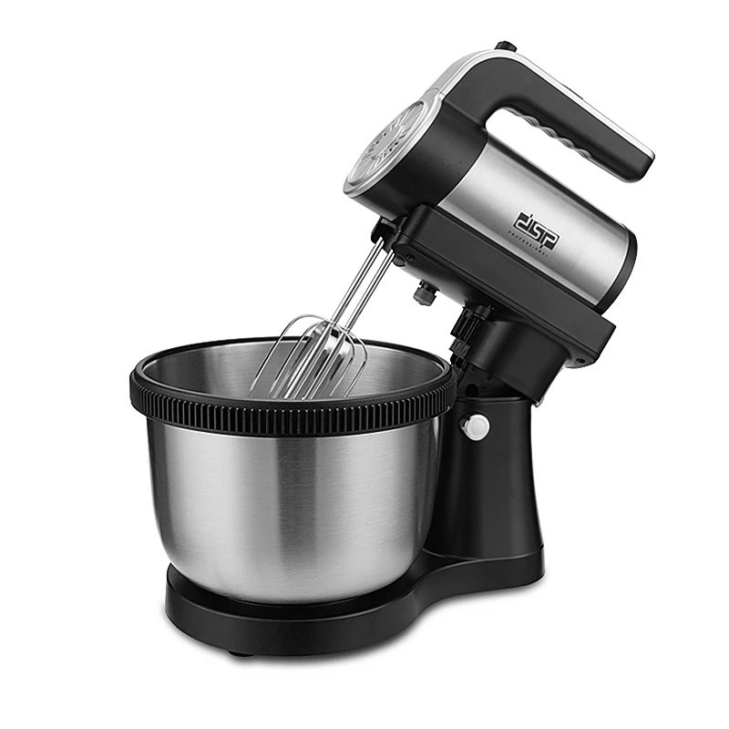 همزن کاسهدار DSP KM-3058 یک دستگاه پرقدرت و کاربردی برای آشپزخانههای خانگی است. این مدل برای همزدن، مخلوطکردن و حتی ورز دادن خمیر مناسب است. کاسه استیل ضدزنگ آن با ظرفیت ۴ لیتر امکان آمادهسازی حجم زیادی از مواد را فراهم میکند. این همزن دارای عملکرد توربو است که باعث میشود بتوانید متناسب با نوع مواد (از خامه و سفیده تخممرغ تا خمیر سنگین) سرعت مناسب را انتخاب کنید. یکی از ویژگیهای مهم این مدل، دوکاره بودن آن است؛ یعنی میتوانید هم بهصورت همزن کاسهدار از آن استفاده کنید و هم موتور را جدا کرده و مانند همزن دستی به کار بگیرید. برای راحتی بیشتر، دستگاه به پایههای ضد لغزش مجهز شده تا هنگام کار حرکت نکند. همچنین دکمهی Eject تعویض سریها را بسیار آسان کرده است.