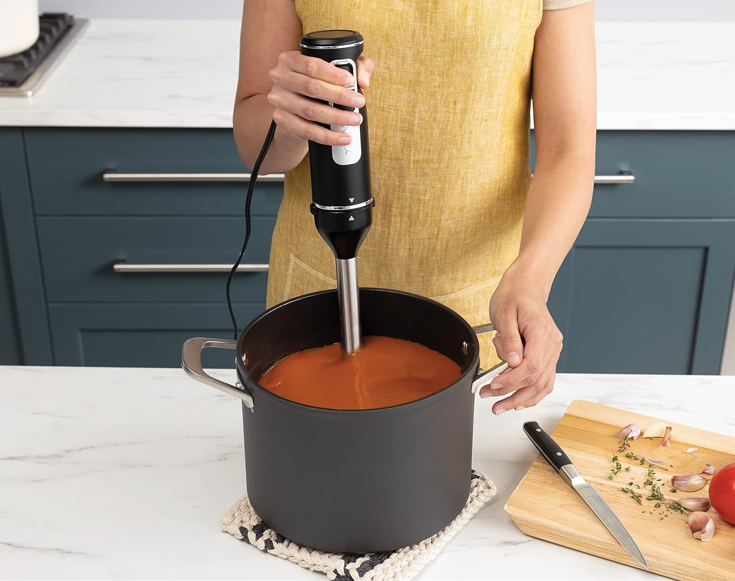 بلندینگ (خرد و پوره کردن): با بازوی غوطهوری (Immersion Blender)، میتونی سوپ، سس، پوره، هوموس، پستو، سالسا یا حتی غذای کودک درست کنی. مستقیم تو قابلمه یا ظرف مواد رو میکس میکنه بدون نیاز به انتقال مواد.